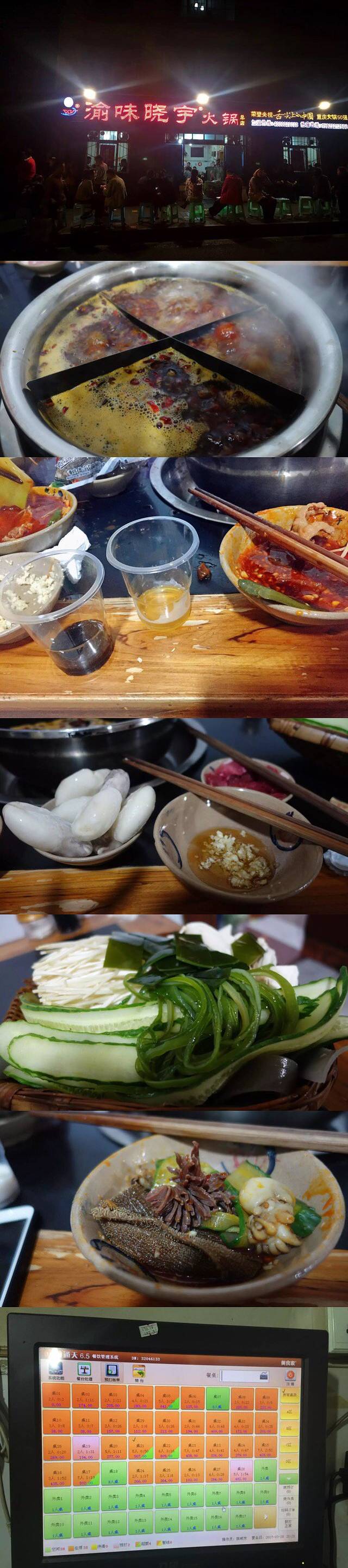 然后又是拍拍拍,现在印象最深的就是磁器口那里的降龙爪爪(10元3个)5个味道,好吃~跟曹氏是差不多的~有很多分店,都排队哟~可想它是真好吃哇~~逛吃逛吃就准备上山去渣滓洞了~全程爬楼梯下楼梯,上下上下~由于个人觉得没啥意思~就是有点累,太累了~~就想赶紧回酒店休息一下。下了山,到了车站,10元一个人回到磁器口,然后打车回酒店,休息~~在回去的路上,预约了晚上吃的火锅(渝味晓宇火锅,上过舌尖上的中国,经人推荐)~由生意太好了,我们四点打电话,给我们安排到了八点~OK,回酒店睡觉,休息~~时间差不多的时候,我们就出发去吃晚饭了~这火锅确实跟成都的火锅不太一样,虽然沾酱很很简单就一个香油跟蒜~但是吃起来确实很想~可能是它的锅底自酿的香。还有提醒一下:这火锅千万别点红滚,必须点鸳鸯锅,是真的!不然,辣死人!作为一个喜欢吃辣的合格的辣妹子,我都要被辣哭了…喝水喝奶喝王老吉没用,我是喝醋才解决的!我闺蜜胃都辣痛了、还是嘴贱,继续吃!😅、身体要紧~最后两人吃了198元~还是很划算了。打道回府、吃消炎药,睡觉😪
