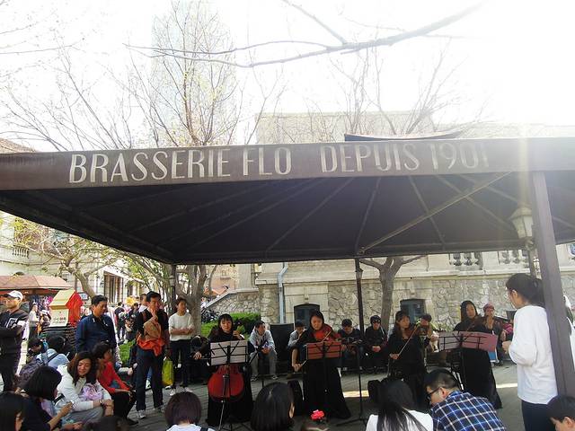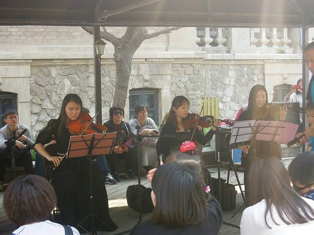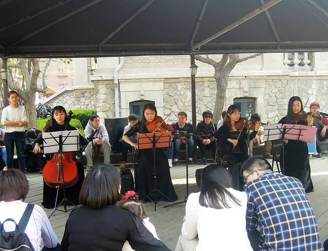 看到女子演奏团在现场演奏曲子,动听的音乐让人不忍心离开。