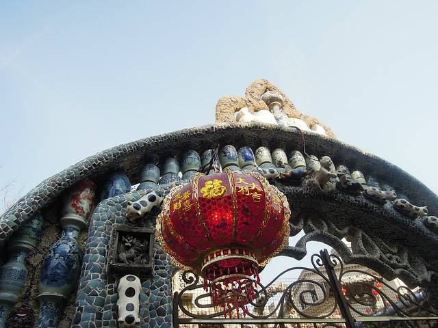 灯笼上印着恭喜发财 大吉大利,整个楼房都是用陶瓷镶嵌而成,大概用去了4亿多片以宋元钧瓷为主的古瓷片。
