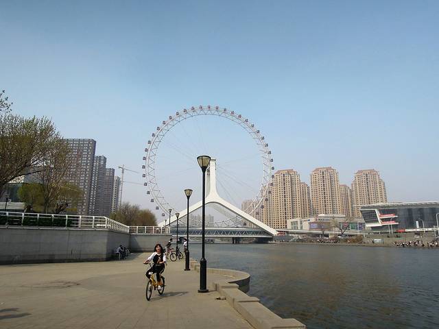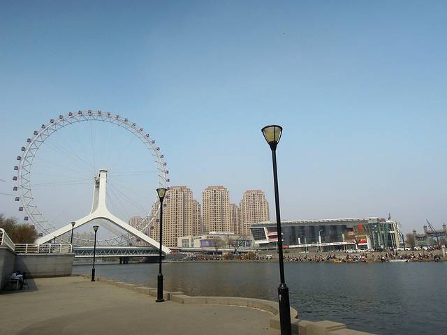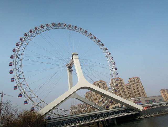 天津之眼位于天津市河北区三岔河口永乐桥上,是世界上唯一的一座建在桥上的摩天轮。摩天轮的直径110米。2008年,天津新地标摩天轮落成。