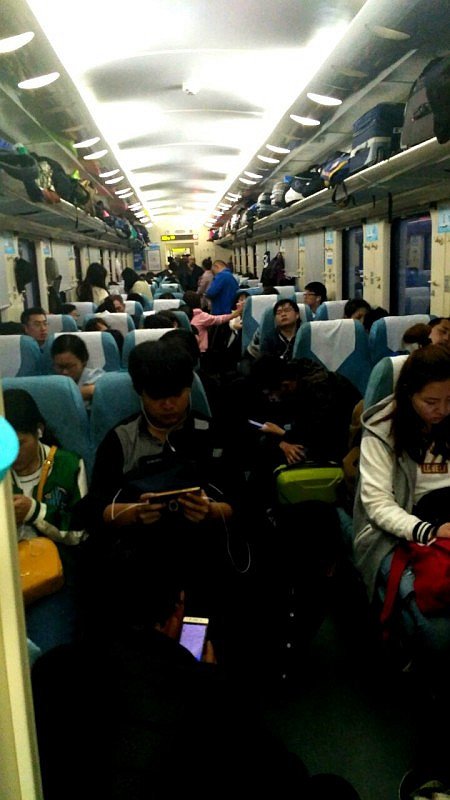 原谅我的这张照片,在行走的时候拍摄,照片视线有些模糊。坐在行驶的列车上,对面的新疆乘客也是到达天津,听她们说,她们一行三人出发,订了两个座位,其中有一个小伙伴的座位被一大叔占据,说什么也不给让开,这种情况可以反映给列车员啊!!!