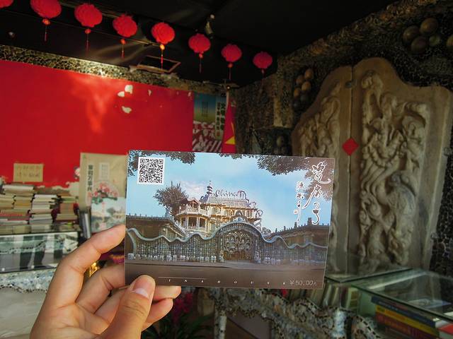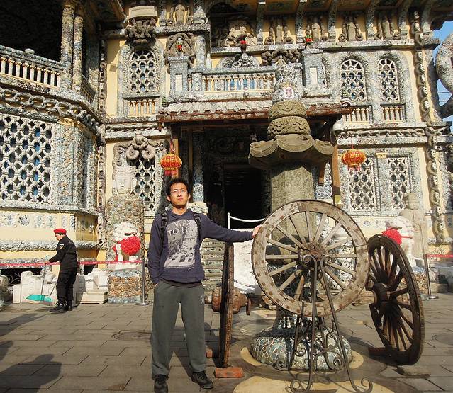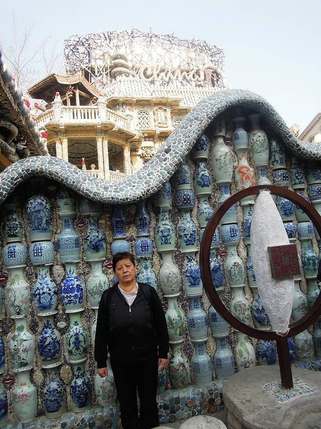 在瓷房子面前合影留念,可以看到院子围墙全都是用大小不一的瓷瓶垒起来的,且大都以元青花为主。旁边的员工正在打扫卫生。