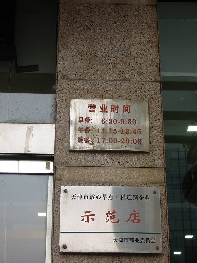天津市放心早点工程连锁企业 示范店 墙壁上写着营业时间
