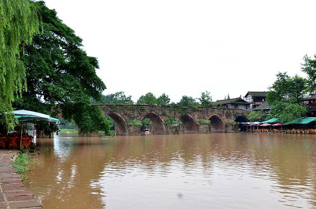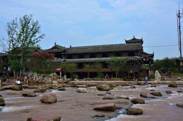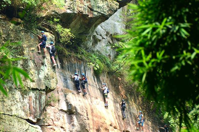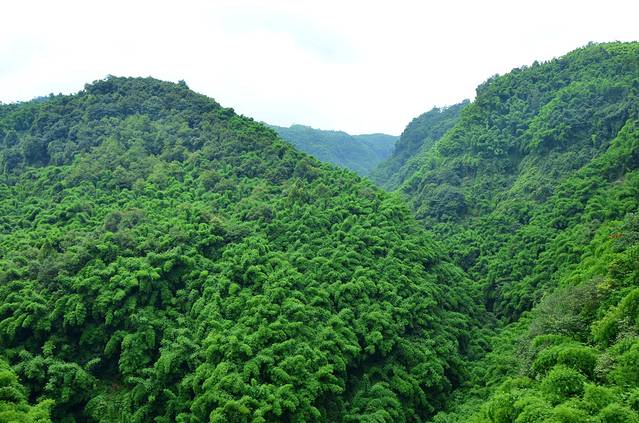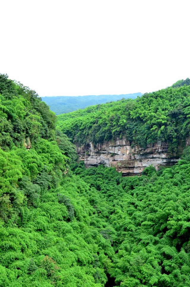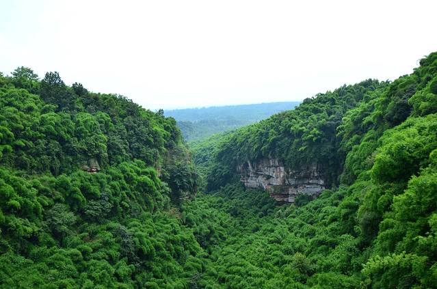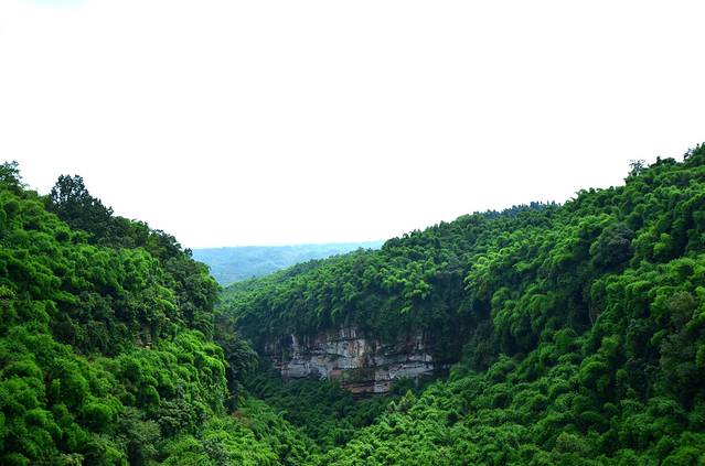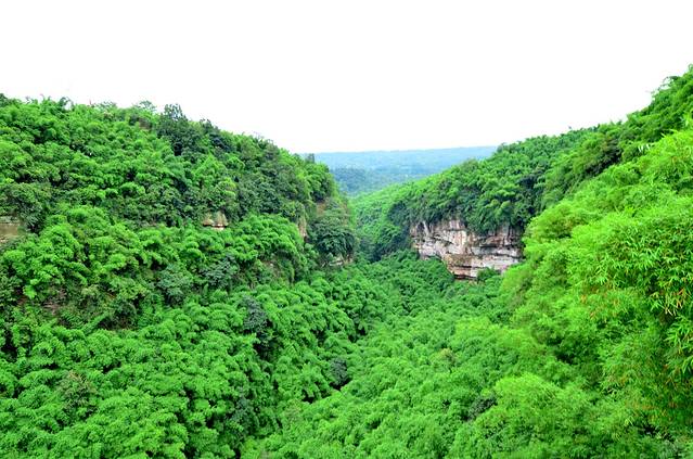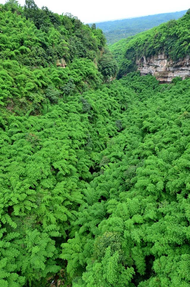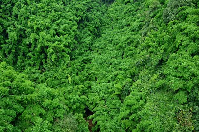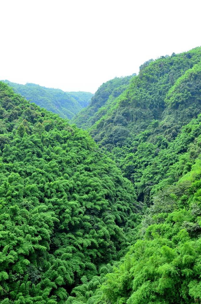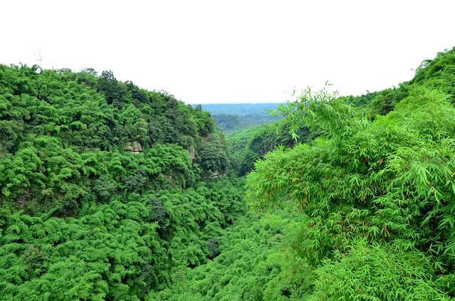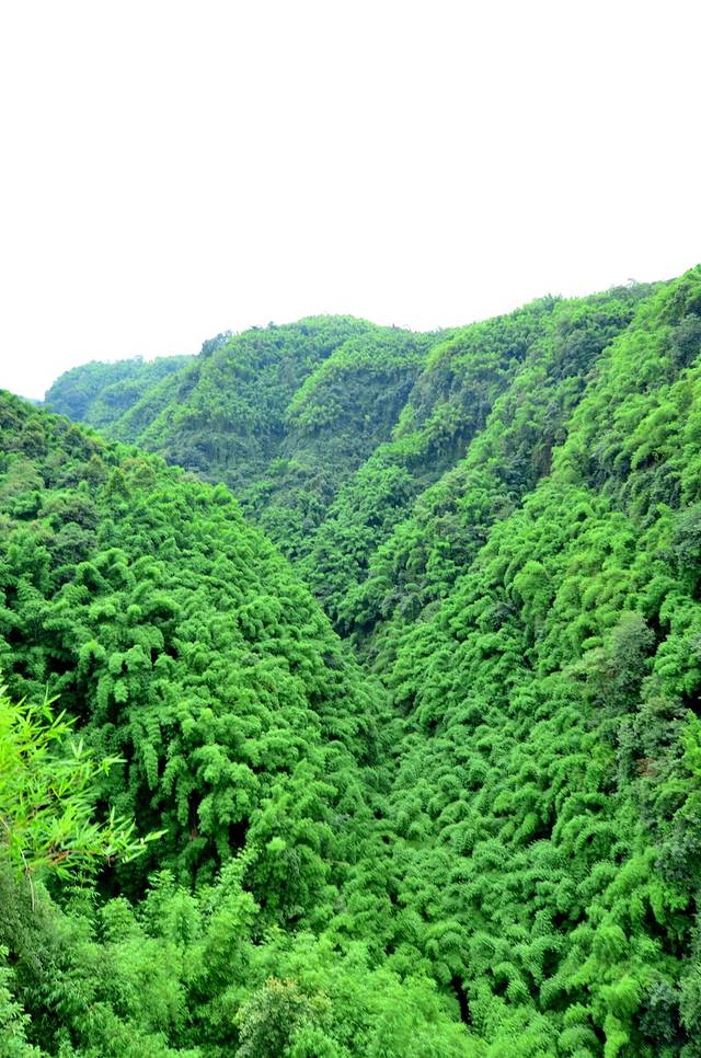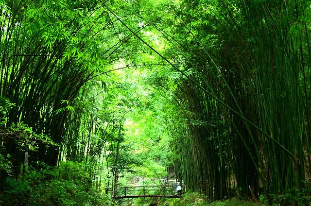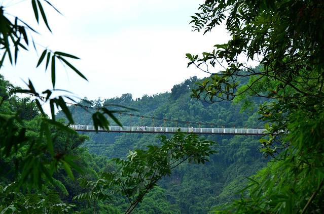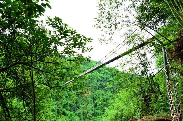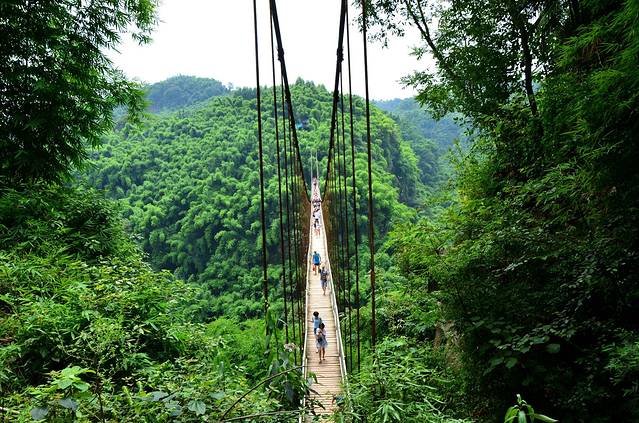 金鸡谷就在平乐古镇所在河流的上游,摆渡车十分钟左右就到了。门票30。过了检票口,爬半小时左右,就是吊桥。洗肺的好地方,翠绿的竹海,两座山之间长长的吊桥,站在吊桥上,下面是一百多米深的山谷,山谷里满满的翠绿色。和人水平是蜿蜒的翠绿色的山谷。在吊桥上转360度,所看到的都是竹海