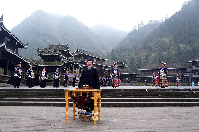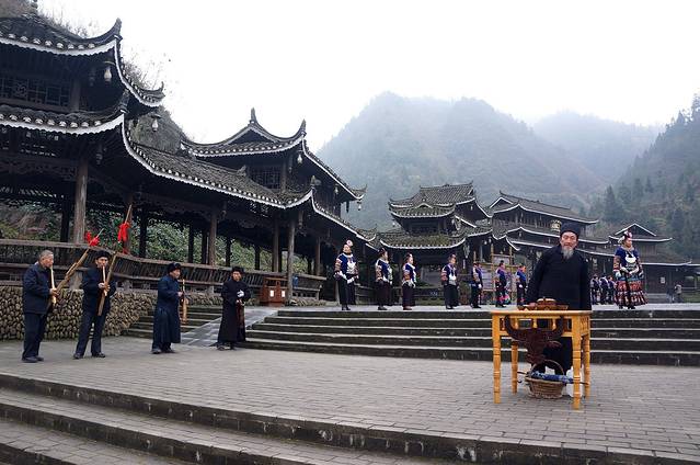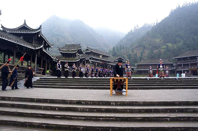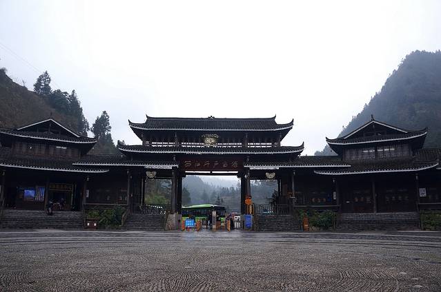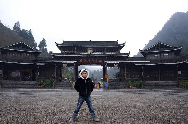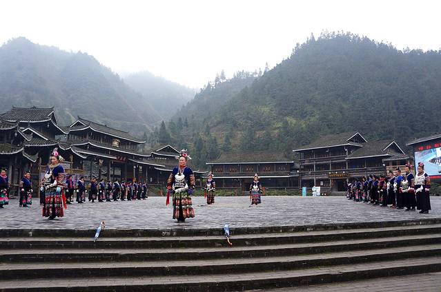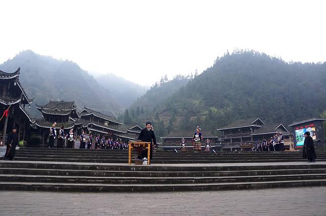 “千户”回渝,选择从“凯里”直达,路线从“千户”坐到“凯里”直达车;一小时时间;因为是逃票进入,所以出来才看见,在大门还有这样的迎宾仪式,挺特别,但是演员估计也是被磨皮了,多少有些懒散。
