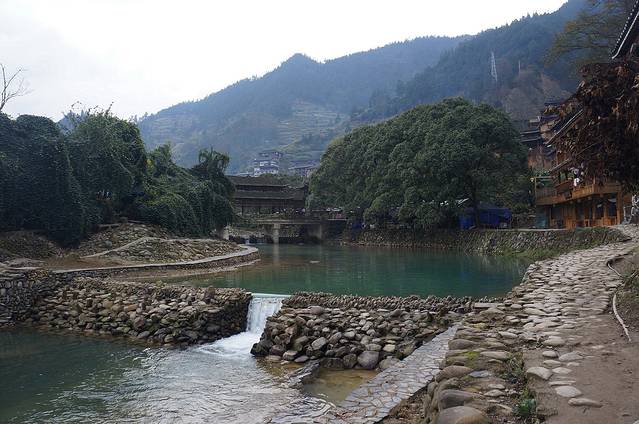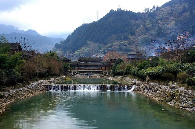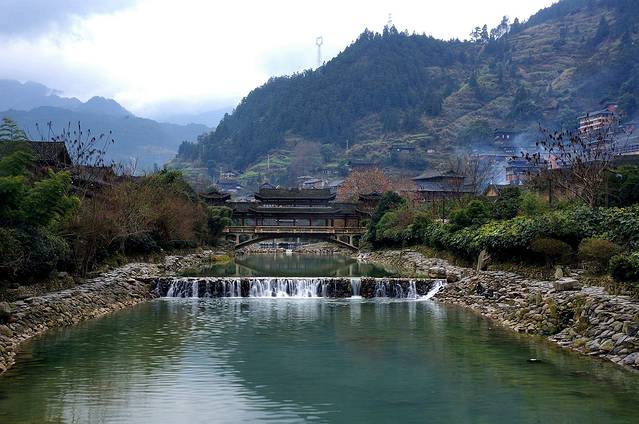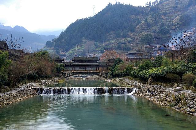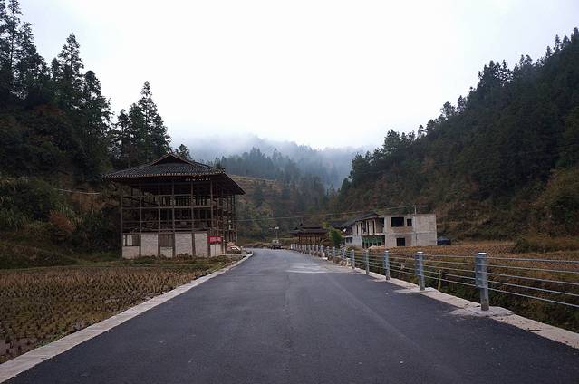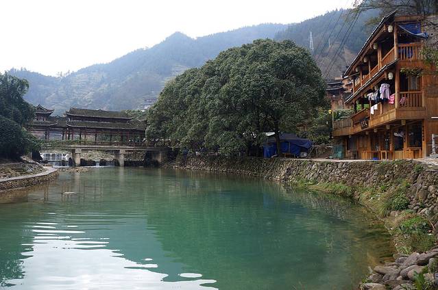 在“观景台”拍完照片后;顺着大路回到“一号风雨桥”路上景色也是相当漂亮;回到“一号风雨桥”,在“风雨桥”左手边就可以上山,进走苗寨更接地气儿的苗家住宅,一路的苗寨风情,气氛浓郁。