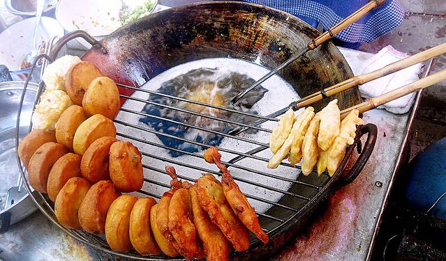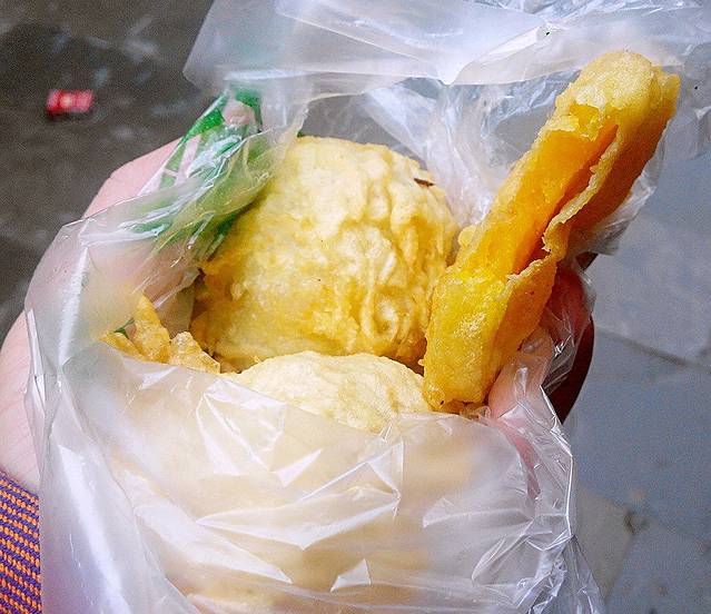 在古镇的巷道里发现了儿时的小吃,毕竟“贵州”本就离开“重庆不远”嘛!分别都是“炸红薯”:与重庆做法的区别,这里是整块裹上面粉炸,我们哪里是切成小颗粒;“炸糯米丸子”这个重庆没有两个口味甜点与咸的
