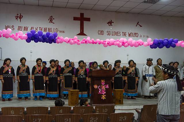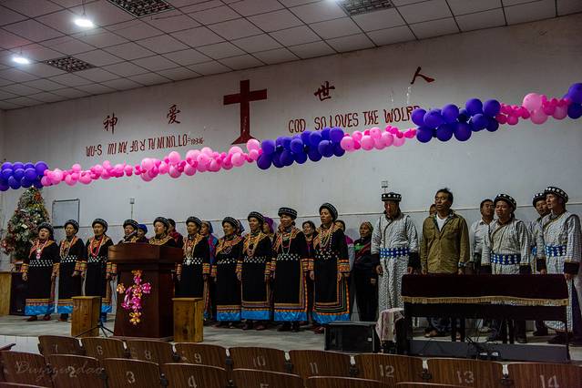 回到六库天已经全黑,顾不上放行李,随便找家饭馆晚餐后,前往百花岭教堂,聆听素有天籁之音的傈僳族无伴奏四声部合唱。据领队鸵鸟及当地导游朱师傅介绍,这场短短约半小时的演出是为俺们团队量身定做的。