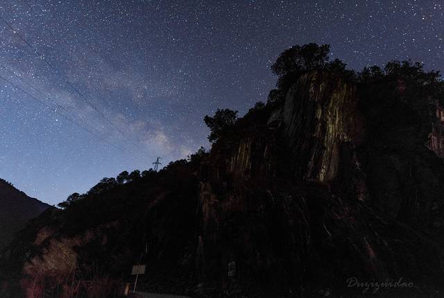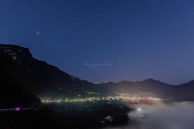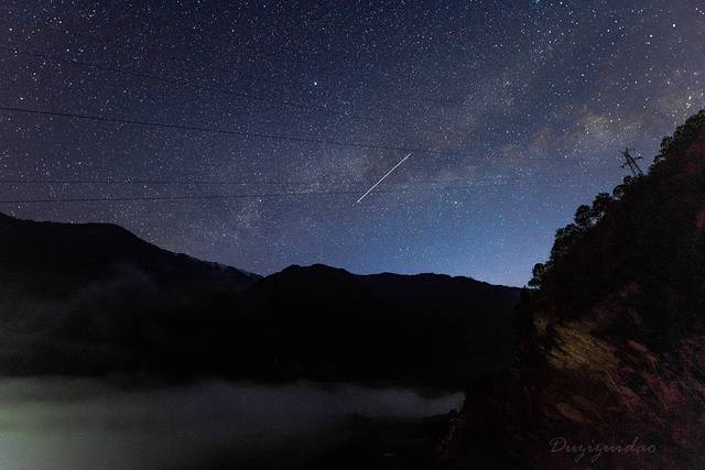 ↑ 丙中洛桃花岛附近的星空。下薄雾笼罩怒江,上刚好有流星划过天际