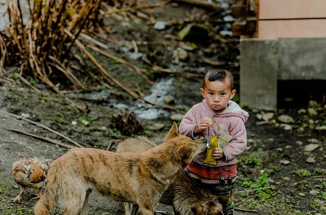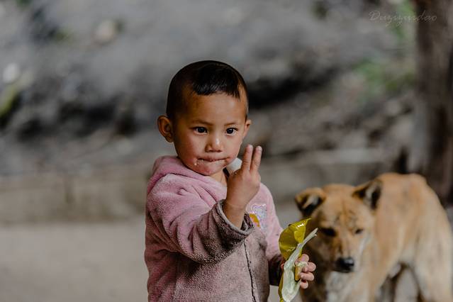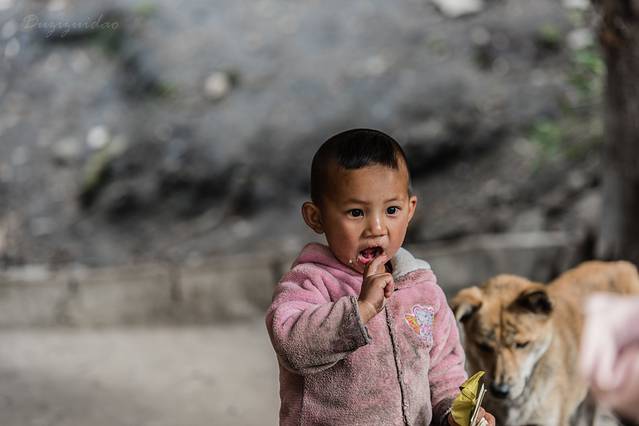 遇到一个独龙族萌娃 ,这几条小狗一直跟着他转,就因为他在吃东西