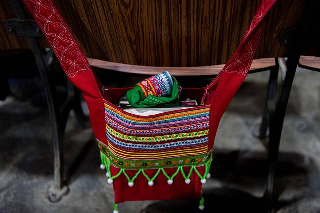 ↑ 独龙族阿婆身披独龙毯安静的坐着。据说在以前,独龙毯是独龙族男女的唯一服饰,白天是衣服,夜晚就成了被子。