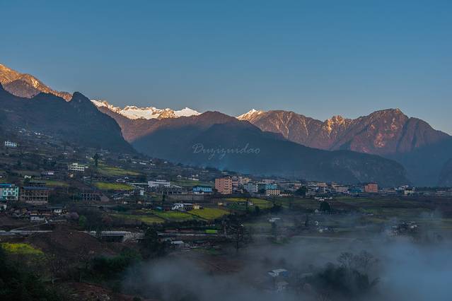 ↑ 晨昏下的丙中洛,远处是高黎贡雪山的主峰嘎娃嘎普