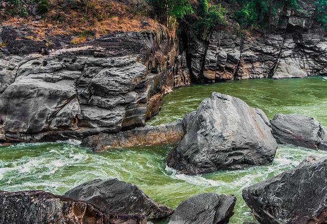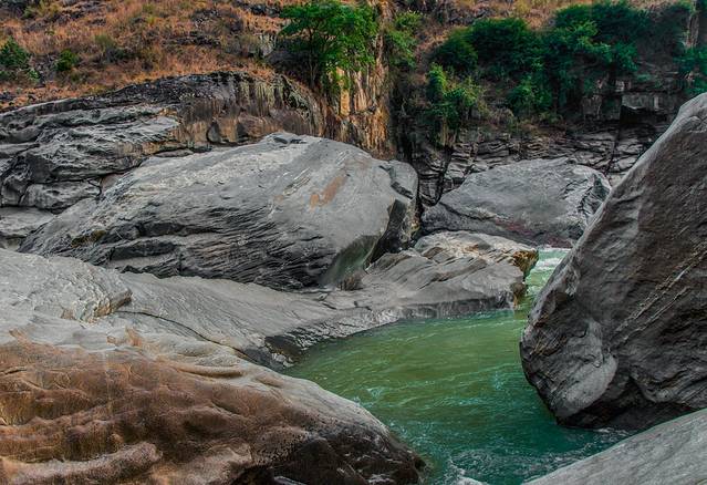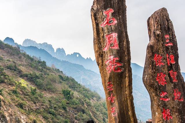 沿丙中洛溯江而上,就来到石门关,两座直立的悬崖峭壁屹立在怒江两岸,直立的石壁活似两根石柱插入云端。从古到今,石门关两边的人民往来,只有在怒江水落潮的时候,从绝壁下的沙滩通行,一到水涨,淹没了沙滩,路断难行,就是猴子、岩羊也过不了石门关。
