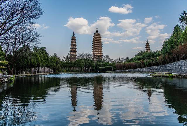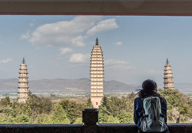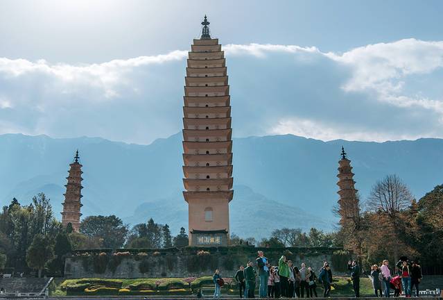 到丽江机场约11点20左右,乘坐机场大巴约12点半左右到达丽江城区。机场大巴终点出门左拐约2-300米就是大巴高速客运站。刚好有12点40分去大理的大巴,来不及吃午饭,匆匆买了一小袋蛋糕就上车了。下午不到16时就到达了大理,住进了预定好的宾馆,丢下行李,出门乱逛。原计划的环洱海铁定去不了,就逛逛三塔,溜溜古城算了。