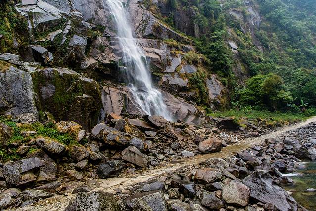 哈巴瀑布:也叫月亮瀑布、哈旁瀑布,据说因月亮是从山顶瀑布飞泻处升起而得名,尤其在有明月的夜晚观看最为壮观。当地人称“哈巴依称”,“哈巴依称”是傈僳语,意思为“月亮上掉下来的水”。看现在瀑布貌似温驯,据说丰水期时,瀑布从山顶飞泄而下,直达独龙江中,气势磅礴。