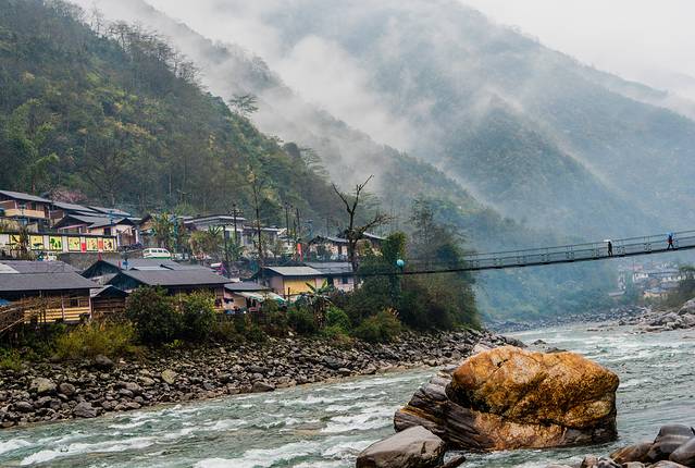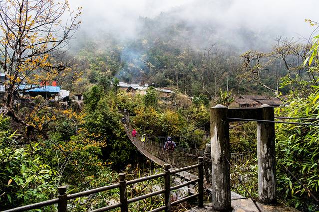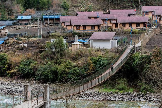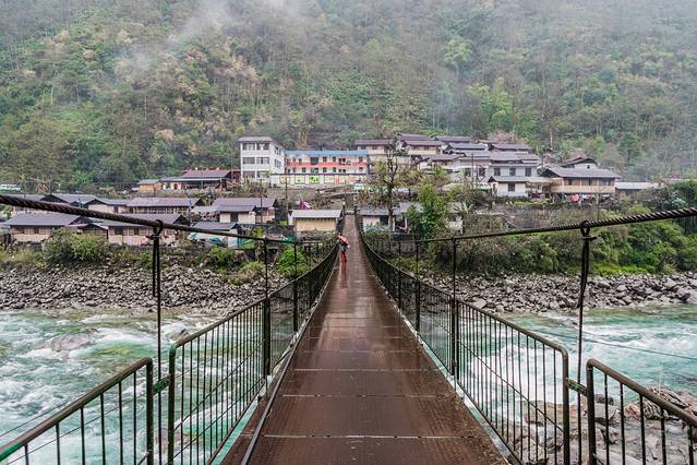 ↑ 一座人马桥,横跨独龙江,连接着小村落两边