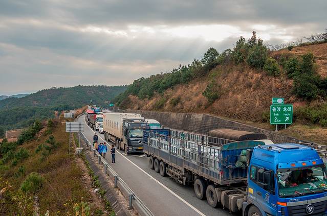 上高速不久,就被堵在路上。问兜售小商品的当地人,说7点就已经堵了。