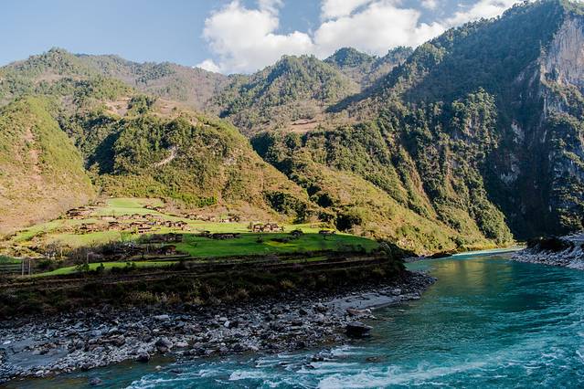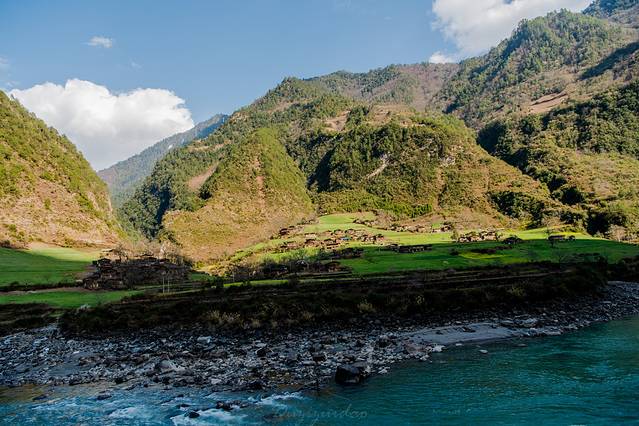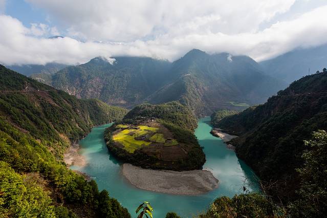 第一次知道丙中洛这地方,是因为田壮壮导演的纪录片《德拉姆》。当时就在想,如此美妙的一个去处,人神共聚之地,今生我一定得去一回。丙中洛坝子海拔1750米,是怒江峡谷深处难得一见的开阔台地,面积约为15平方公里,四面环山,整个坝子被念瓦洛河和格马洛河分割成三大块,平坝周围的石崖多为羊脂玉岩,南为贡当神山,北为石门关,南北遥相呼应,形似"相约无期"的一对恋人,怒江从北部的秋那桶深谷进入丙中洛,从丙中洛南边一直到大拉,形成弯弯曲曲几道弯,最大的一道弯在坎桶被称为"怒江第一湾"。丙中洛村是一片比较平的坡地,四周被群山环抱,满目苍翠。层层梯田一片金黄,阡陌田园之间,又是绿树丛林相间好一派美丽的田野风光。