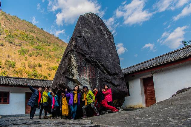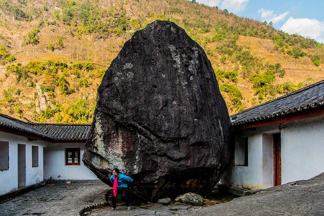 飞来石:貌似很多地方都有叫飞来石的景点,以黄山的飞来石最为有名。福贡这块飞来石来得到真的有些神奇。据说在1983年3月19日凌晨三点,因连续下大雨,怒江东岸山体滑坡,这块重千吨的石头,重重地砸在公路上,接着借助惯性又从公路上弹到5米高的三合院内的10米宽的巨石上。响声惊动了住在院子里的老师,出来一看,惊呆了:院子中飞来了块巨石,而且不偏不倚的落在院中央,直直地立在巨石上。岩体紧靠墙,没有损坏房屋,最值得庆幸没有伤到任何人。这真太奇了,不可思议。另一想,如果巨石稍偏一点,那将是一场房毁人亡的惨剧了。从此人们叫它飞来石,也有人说这是地上的母石引来了公石,因此称它为“夫妻石”,这正是大自然的神力。