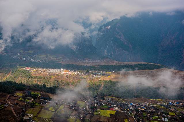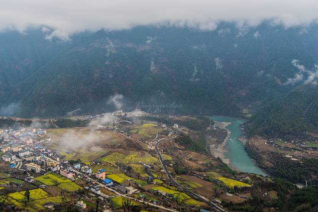 ↑ 云开雾散后的丙中洛,远处可见楼房叠起,过度开发的痕迹凸显