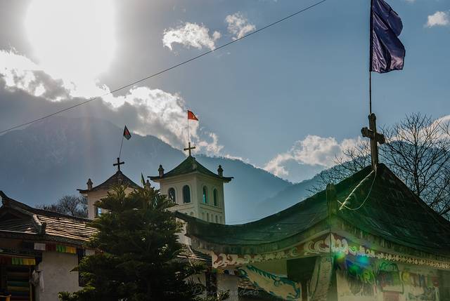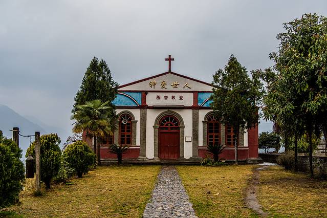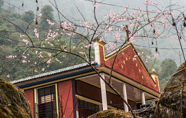 ↑ 在怒江大峡谷沿岸,很多以前法国传教士建造的教堂,老姆登教堂算是最美最有名的一个