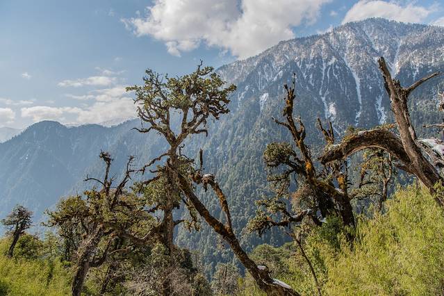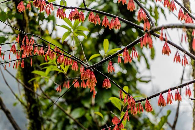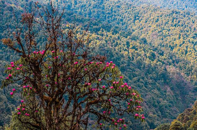公路边峭壁上的大树杜鹃。这里有世界上最大的大树杜鹃群落,最大者树龄500多年,树高25米,基围3.07米
