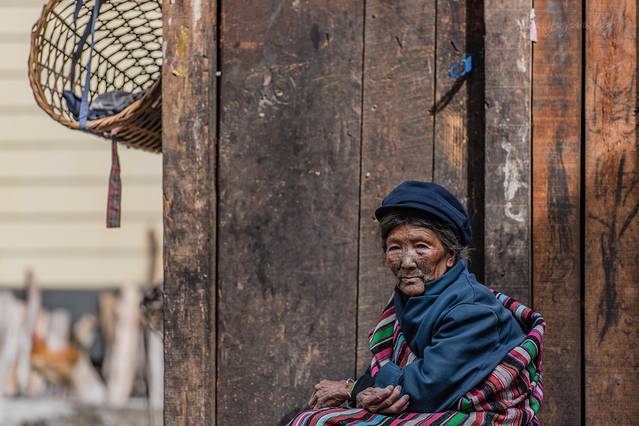 一个独龙族阿婆坐在自家门前,岁月掩盖不了纹面的痕迹