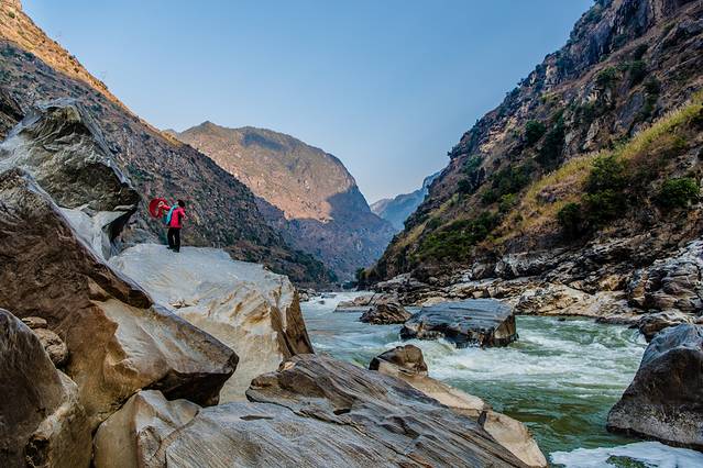 老虎跳峡:傈僳语称为腊跨洛和腊玛登培 ,即老虎跳峡谷之意。峡谷两岸峰峦重叠,峭壁如削,江中怪石林立,虎跳石为一块2米见方的巨石横卧在江心,江水从巨石两侧跌落而下,水流湍急,浪花飞溅,震耳欲聋,轰鸣声响彻云宵。此处被视为傈僳族的虎氏族发源地,与著名的虎跳峡有着类似的传说。