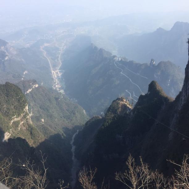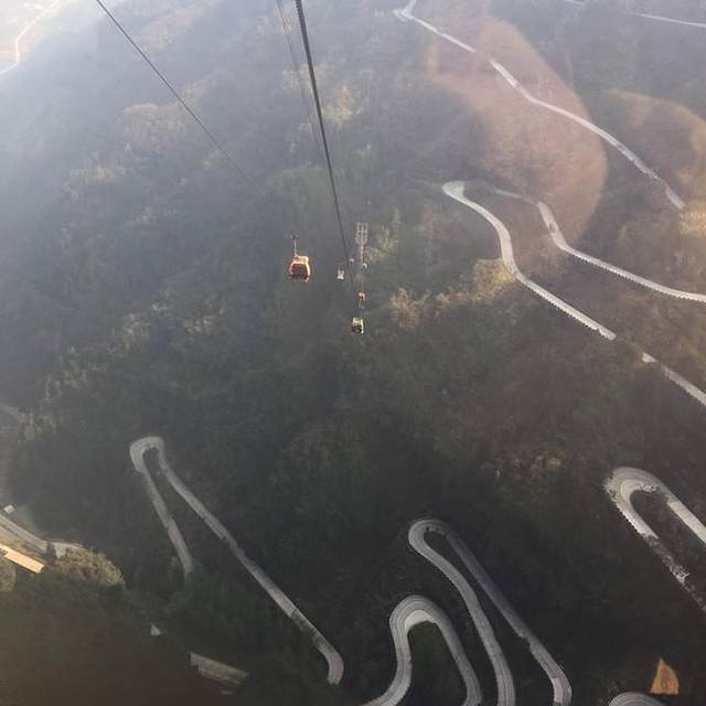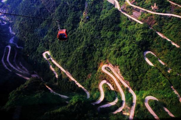 慢慢上升,就看到了著名的天门山盘山公路,俯瞰被称为“通天大道”的99道弯的山路。