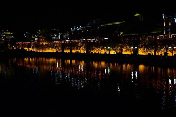 因为今天已经是节假日,所以我们并没有选择昂贵的江景房,老老实实踱步沱江边看夜景好了。