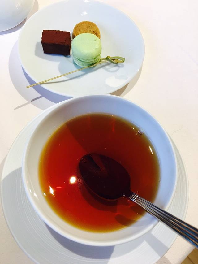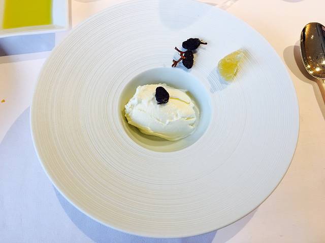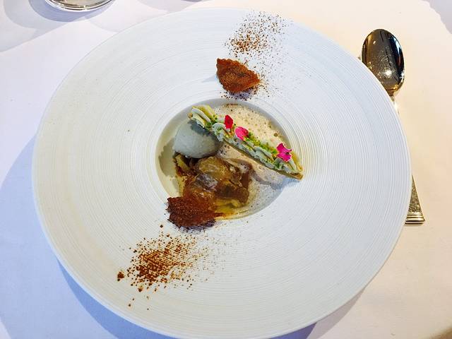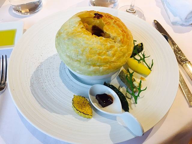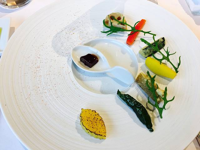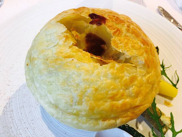 这道不得不夸一下日本人的幽默,先上了勺子中一块小牛肉,当我心中产生疑问的时候,说是不是觉得吃不饱,其实主菜在这里,才端来了舒芙蕾牛肉。。。