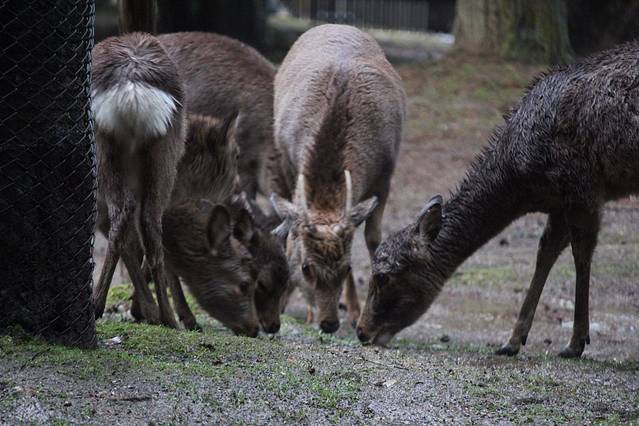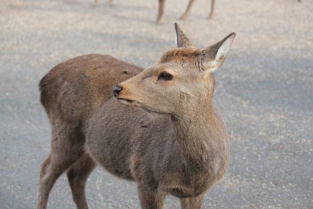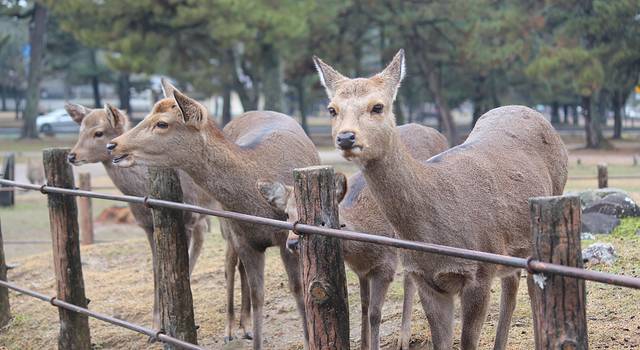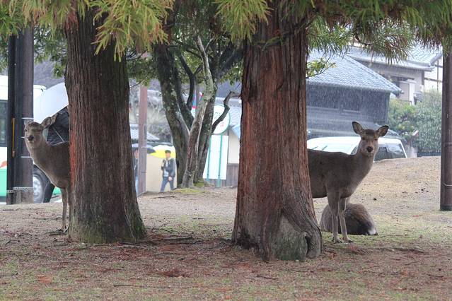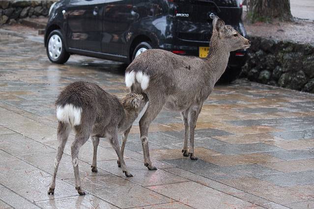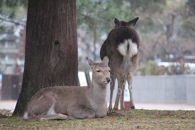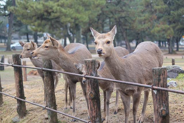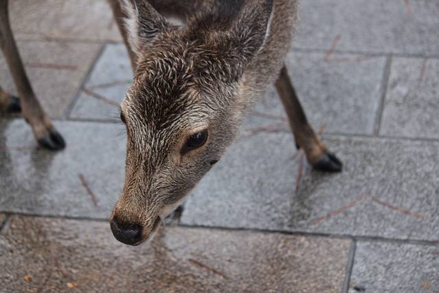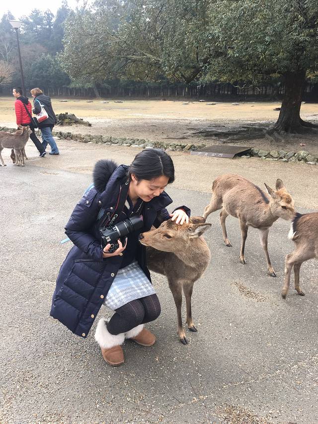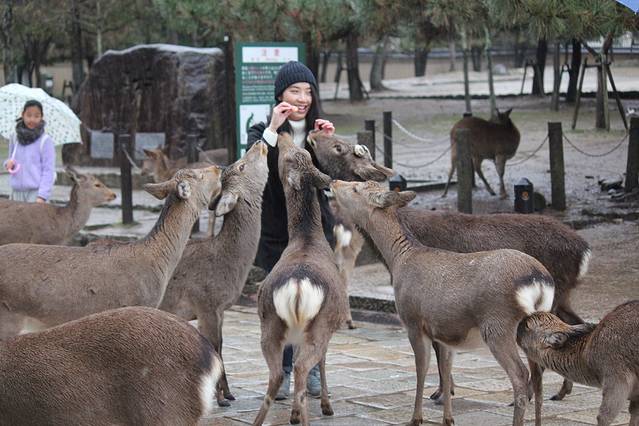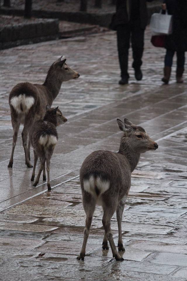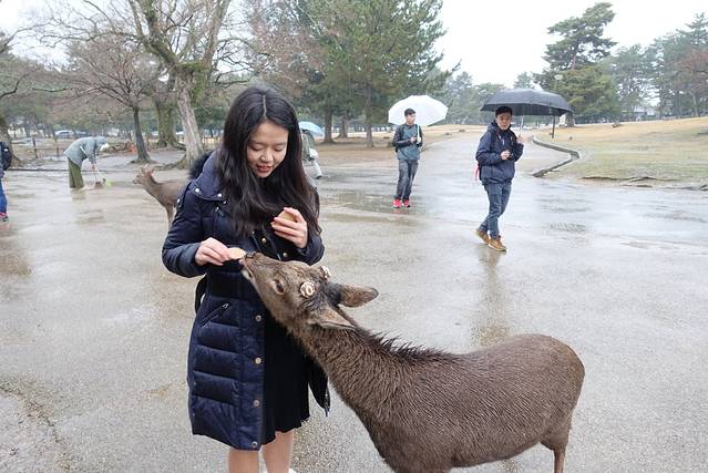 奈良喂小鹿是我这次旅行的重点了,两晚都住在奈良,第一天都是中雨偏大,买了鹿仙贝,他们就会很块的围过来要你喂,你可以把仙贝举高,有些鹿宝宝就会给你点头鞠躬,让你赶紧给他仙贝吃。大的鹿会用嘴拽你衣角,或者顶你,为了引起你的注意。仙贝一扎150日元有10片,特别需要注意的是,鹿对纸质的东西都特别敏感,我清水寺的门票就是放口袋里牺牲的。