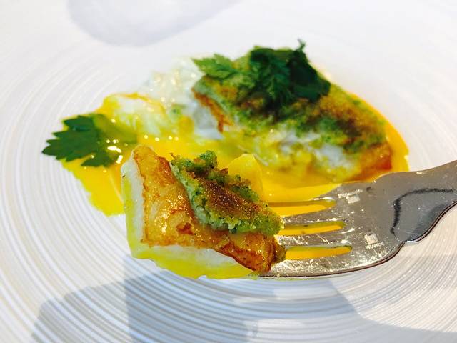 鱼肉鲜嫩,汤汁带微微酸味,上面焗烤的草本芝士,口感香脆略带清香,使鱼肉味道更有层次。