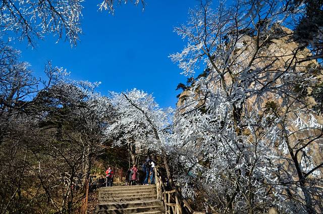 在这个严寒的时节里,山顶上的冷空气就像是一位大艺术家一样,把这里的雾凇的景色在黄山山顶上刻画的如此的美丽与震撼!