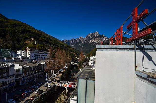 在天台上可以看得到远处的黄山山体与整个汤口老街的景象,魅力的黄山与美丽舒服的汤口老街融合一体成为黄山徽湘精品客栈天台上一道靓丽的风景线与特色之一了。