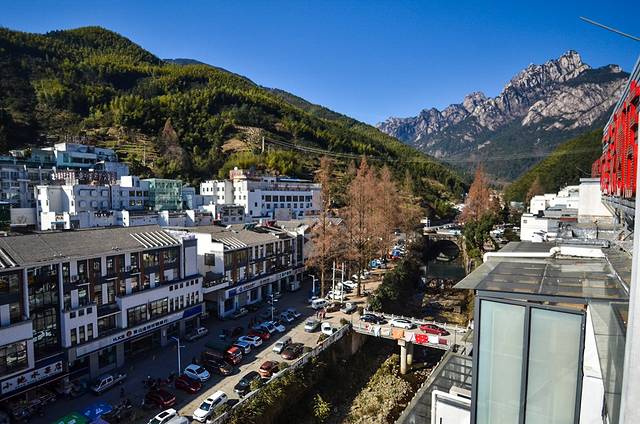 阳台这一块的视野很开阔,可以说是很直觉的看得到黄山与汤口老街的部分区域,而且空气质量相当的不错。倘若是夏季来这里度假入住的话,肯定是非常的舒服。因为,夏季这里更加凉快、景色的能见度更高、空气的通透感更好。