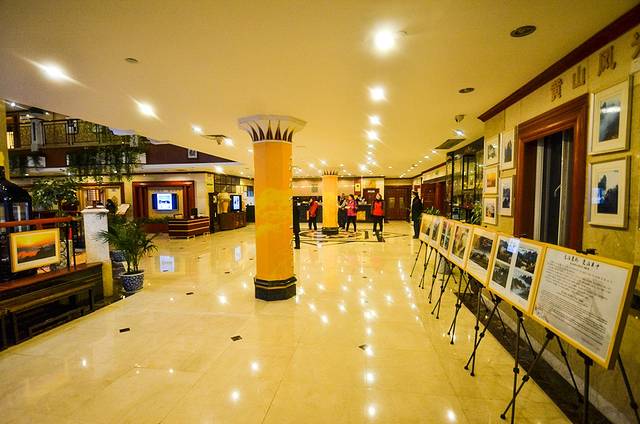 黄山狮林大酒店的大厅是以黄山摄影文化为主题的区域,整个大厅非常大,预计在黄山山顶之上老牌国有四星级酒店之中的大厅是最大的了吧。