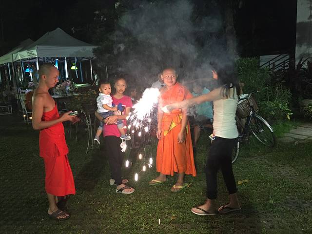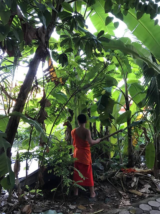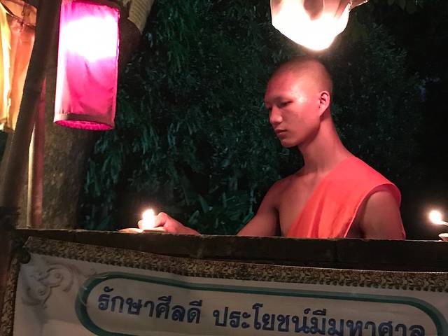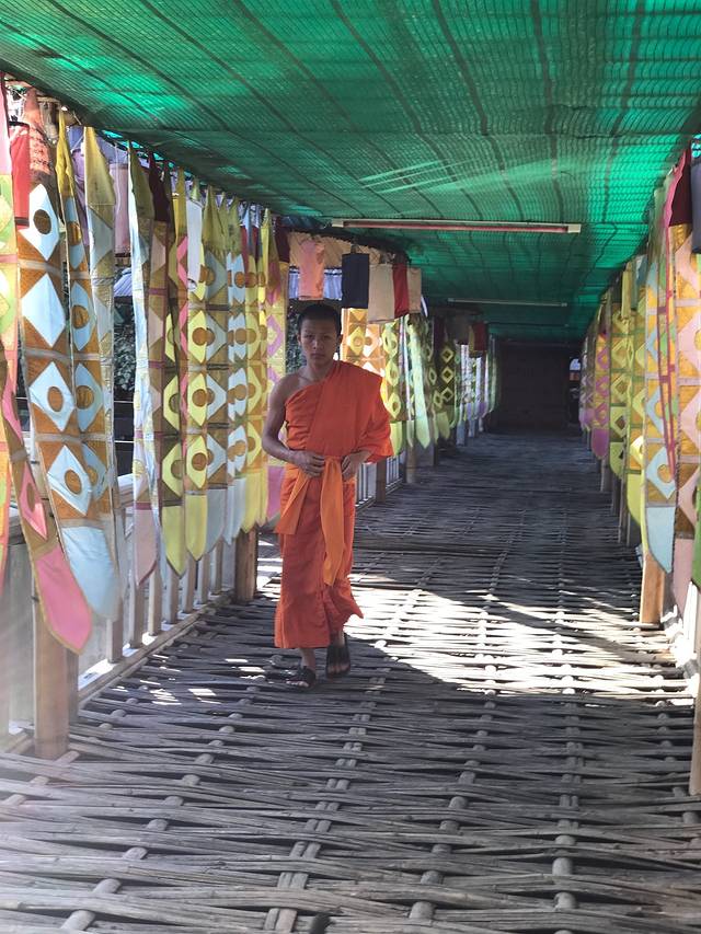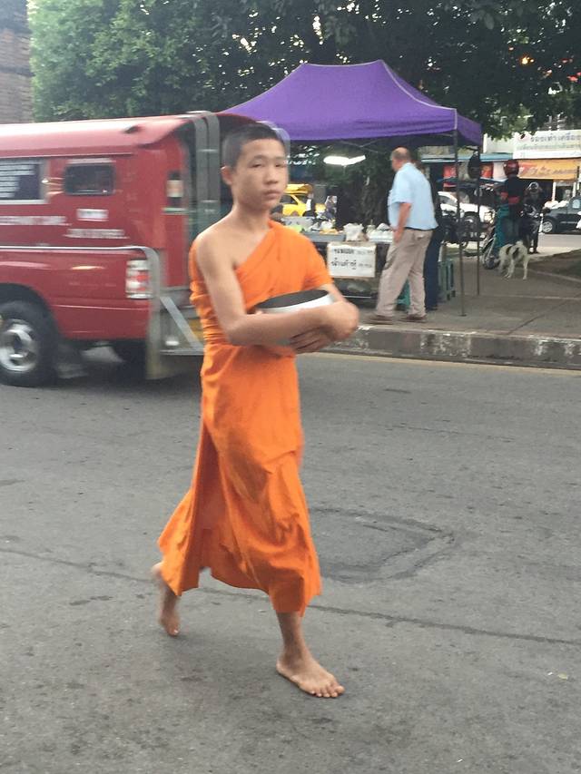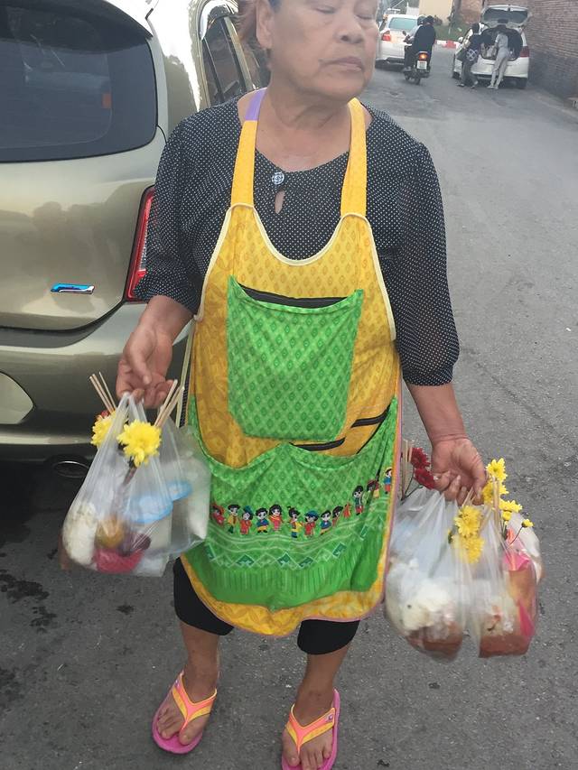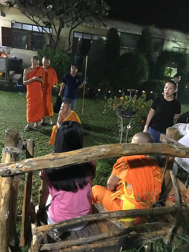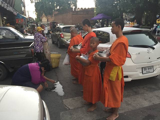 14号早上起的巨早,6点就到清迈门市场等和尚化缘了,和尚就是过午不食,他们赤脚站着等着布施,这个叫NIMONKA,他们化缘一化化好几大麻袋的,有商贩叫卖20株一包的化缘食物,直接放到托钵里就好了,女人不能碰到和尚,放好后和尚会念经祝福你,脱鞋双手合十低头就好了,还有人是跪着的。