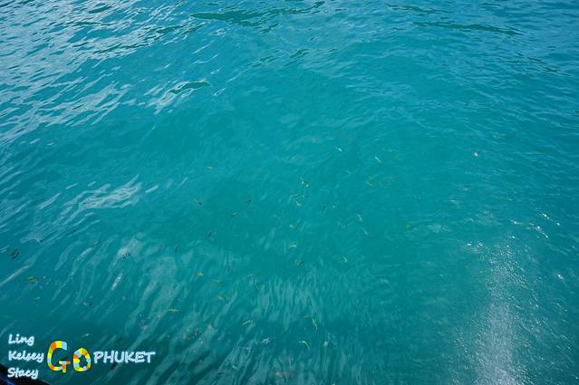船先到了皮皮岛中间的那个大码头,很多游客在这里下船了,船上只剩下去皮皮北和一日游的客人。到这里海水已经开始变得清澈,可以看到很多小鱼游来游去~