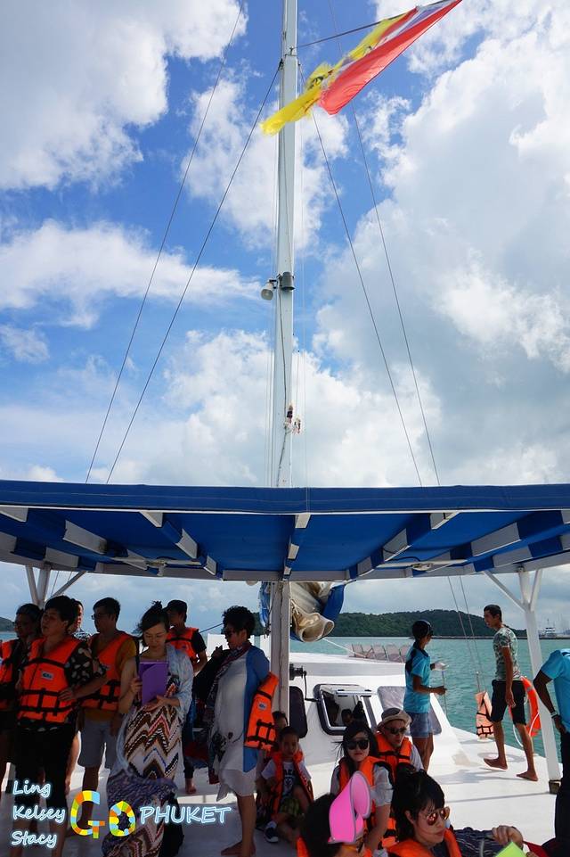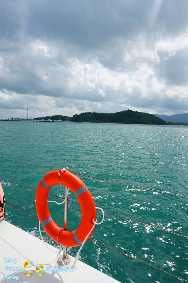 上了帆船,发现还挺宽敞,导游小哥给我们讲了行程安排和安全事项,让我们上夹板一定要穿救生衣,看到最近这次马来西亚翻船事件,觉得还真是有必要。一开始大家都挤在夹板上看景,后来天渐渐阴了,还飘着小雨,大家觉得没意思,都进去船舱。我和小鱼瞬间觉得夹板就是我们的了,开心的各种拍照~