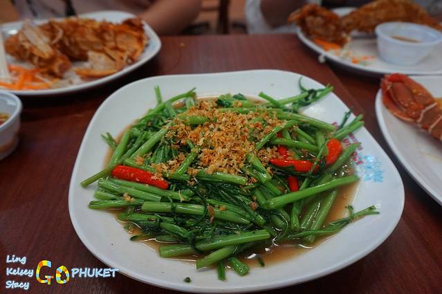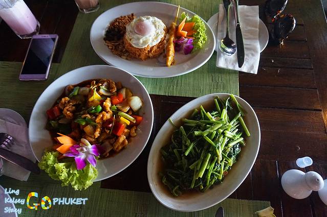 我们刚坐下来吃饭就开始下雨了,庆幸我们之前做了先照相的决定。天瞬间阴了下来,大海也显得很灰暗,我们点了炒饭、炒面和空心菜,一边吃着一边希望天气快点放晴。