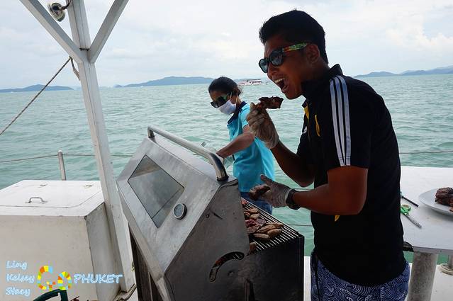 上船后,我们开往下一个目的地,船上开始准备我们的午餐,主要是烧烤,各种猪排、鸡翅,还有带来的虾和蔬菜,非常丰盛。