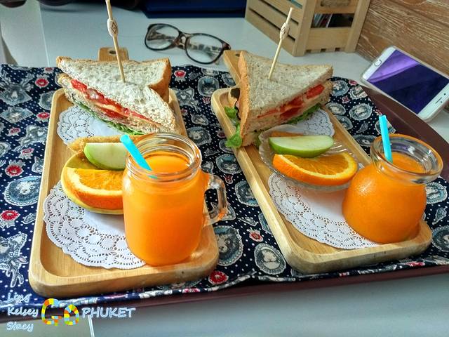 酒店服务员9点钟把早餐送到了房间,简单又精致,橘子汁是鲜榨的很好喝,三明治也不错~
