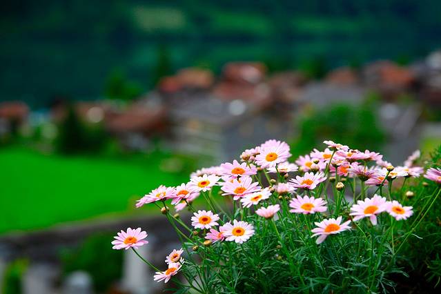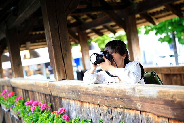 老城建筑上的壁画,木头廊桥上开着浓艳的花。