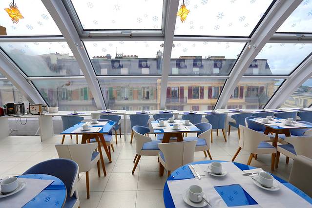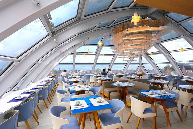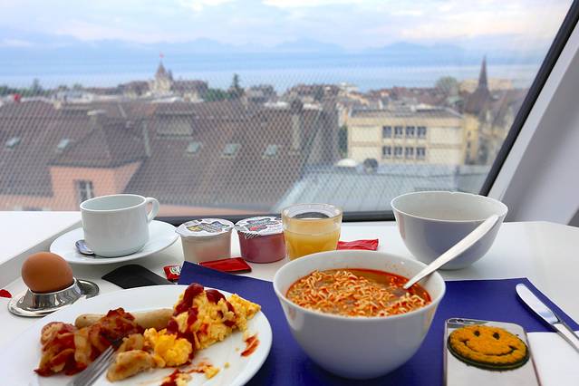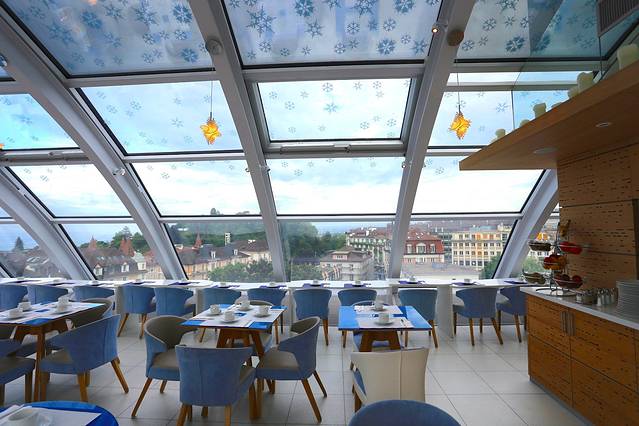 旅行接近尾声,大家也相对前几天起的越来越晚,没想到在洛桑酒店的第二天清晨,我们在早餐厅收获了别样的景色。360度环景餐厅,可以俯瞰洛桑湖泊、阿尔卑斯山和汝拉(Jura)山脉的全景。餐厅顶部雪花的设计,蓝色小清新的设计风格,也让这个餐厅看起来如梦如幻。