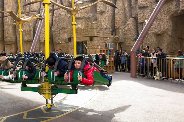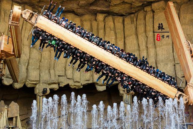 过山龙(4D过山车),这种过山车全世界只有三台,而中国只有一台,就在这里。 其他的过山车,翻转再厉害,座位好歹还是固定着的,这个么,坐在轨道两侧的座位仓中会完全悬空,在过山车上下翻转的轨道运行中同时进行360度自由摆转。从69米、二十多层楼的高空中以90度的俯冲角垂直落下,最高时速达到每小时118公里。在这几乎让人手心出汗的数据前,还安排了多个令人望而却步的翻滚......