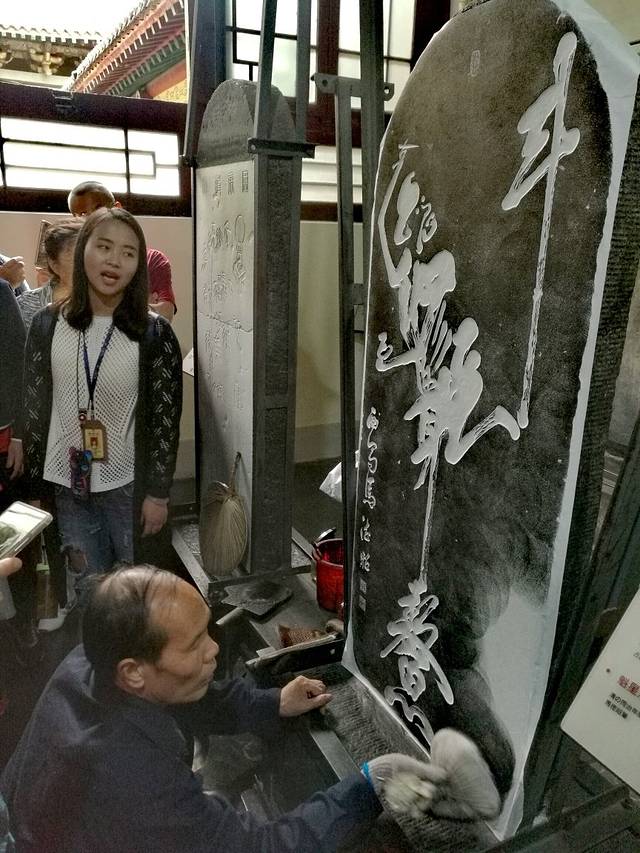 工匠师傅正在拓一个魁星点斗石碑,石碑是字画一体,形成了以字成画,画中容字的独特风格,也充分展现了中国汉字的意象精华。古语有言魁星点斗,独占鳌头,我赶紧拜一拜,希望下月毕业答辩顺利通过