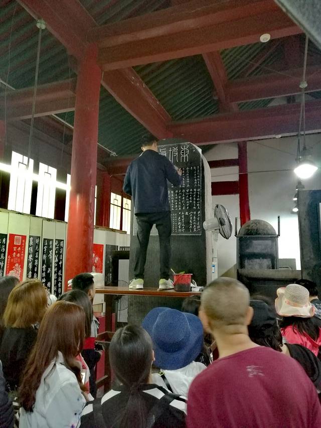到酒店放了行李,马上和小伙伴到碑林博物馆集合。碑林博物馆就在南城墙文昌门西面,这里交通非常方便,我们是从钟楼穿过书院门一路走来的。碑林博物馆碑林博物馆汇集了众多古代历史名家如王羲之,柳公权,怀素等的书法作品真迹!还有著名的唐玄宗所作石台孝经碑(这其中是唐玄宗和杨玉环和自己儿子的故事……有点乱,记几科普吧😂😂)。里面有工匠师傅们现场制作石碑拓本,一本几百到小两千的价格让我敬而远之,不过真的是练书法的最好字帖了(有需求的朋友可以去书院门逛逛,书院门也有卖石碑拓本的,并且价格也相对便宜一些)