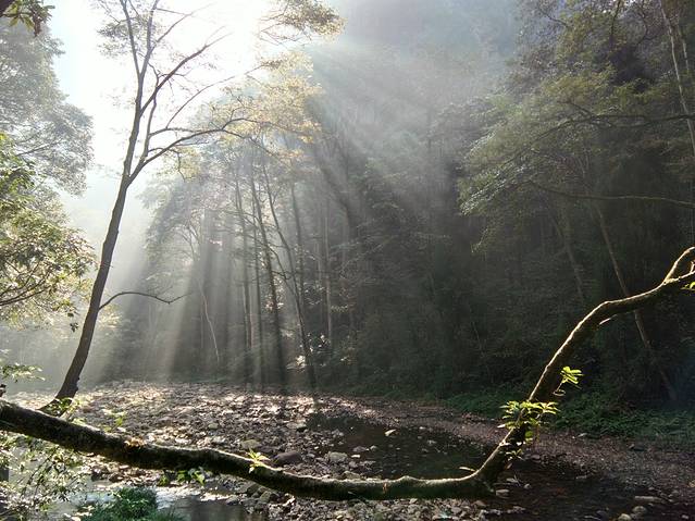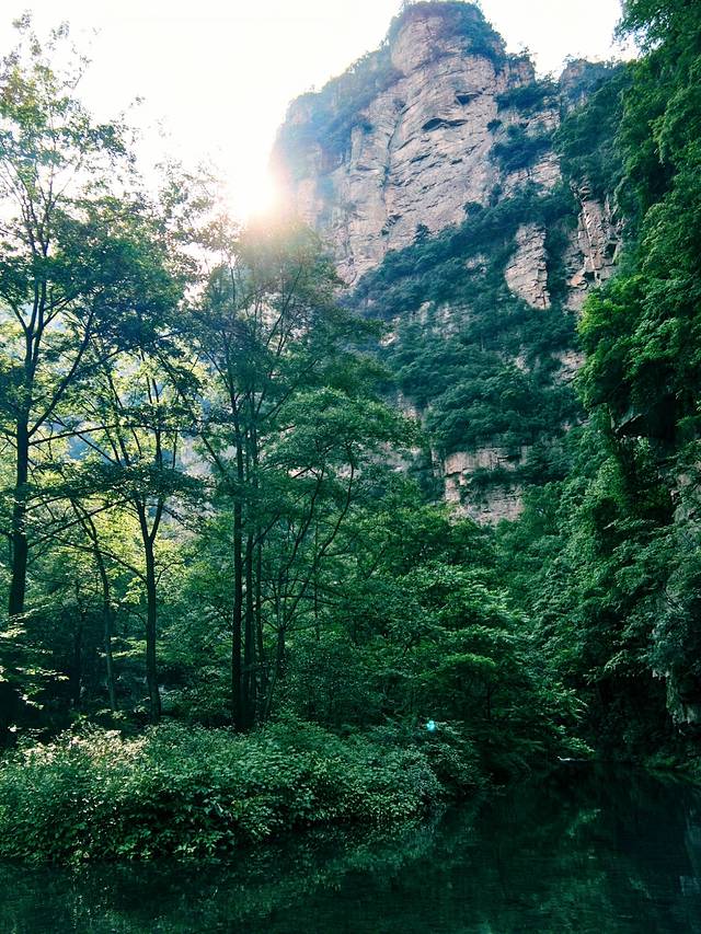 金鞭溪,清晨的阳光透过树叶洒落人间
