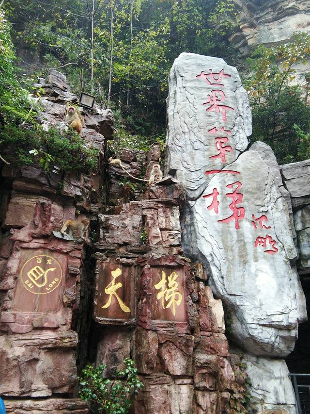 袁家界是我们今天游玩的其中一个景点,进入武陵源标志门之后,去坐环保车,坐车的时候要问清楚车站的工作人员,有分线路的,去的地方不一样。我们要去袁家界乘坐百龙电梯。坐的那趟车沿途经过十里画廊,我们没有下车,想去的朋友可以下车,游玩结束之后原路返回到下车的地方等环保车来再上车就可以了。十里画廊也是一条上山的游道,可以从这里上天子山。车子再往前走5分钟就到水绕四门站,这是金鞭溪的另一头,我们昨天去走过金鞭溪了所以这里也每停留。一直坐到终点站百龙电梯站下车。百龙电梯号称“世界第一梯”,仅需1分28秒的时间就把我们送到山顶,单程票价是72元/人,买完票之后先坐免费的电梯上到观景台——将军列队观景台,这里也有好多猴子。然后才是坐观光电梯,我们在电梯最前面,可以看到对面的山景和长寿村。很美,只是人也很多。上到山顶之后还要步行一段再坐环保车到袁家界核心景区(迷魂台车站)袁家界游玩的景点有:迷魂台——百元大钞(一座长得很像百元人民币的山,哈哈哈)——悬浮山(阿凡达的拍摄取景地)——天下第一桥(天然形成的一座石桥,再次惊叹大自然的鬼斧神工)——八卦图(我看了半天每瞧出来)——三观台——袁家寨子(天下第一桥停车场)袁家界大约游玩1个小时。不过从进入景区坐车换车什么的游玩之后就到12点了,在袁家界这里用的中餐,有肯德基,吃的东西比昨天多很多。毕竟,这里是个以前是个山寨,现在也还有居民居住。吃完中饭,就坐车去天子山啦